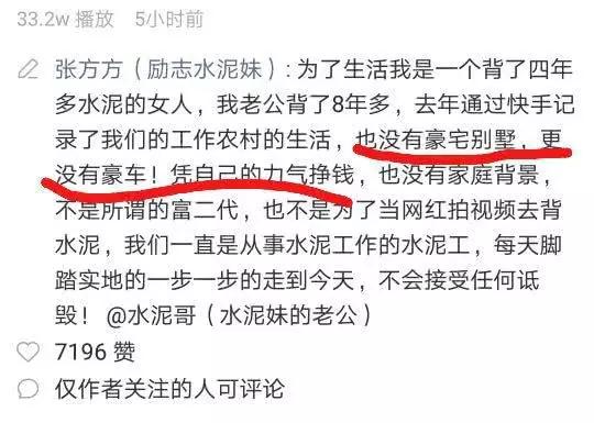 也没有网上说的那些豪宅豪车,只是一个普通人而已。说她自己的工作就是搬水泥,已经背了四年多了,她的老公背了八年多了,只不过去年才通过快手发出来而已。