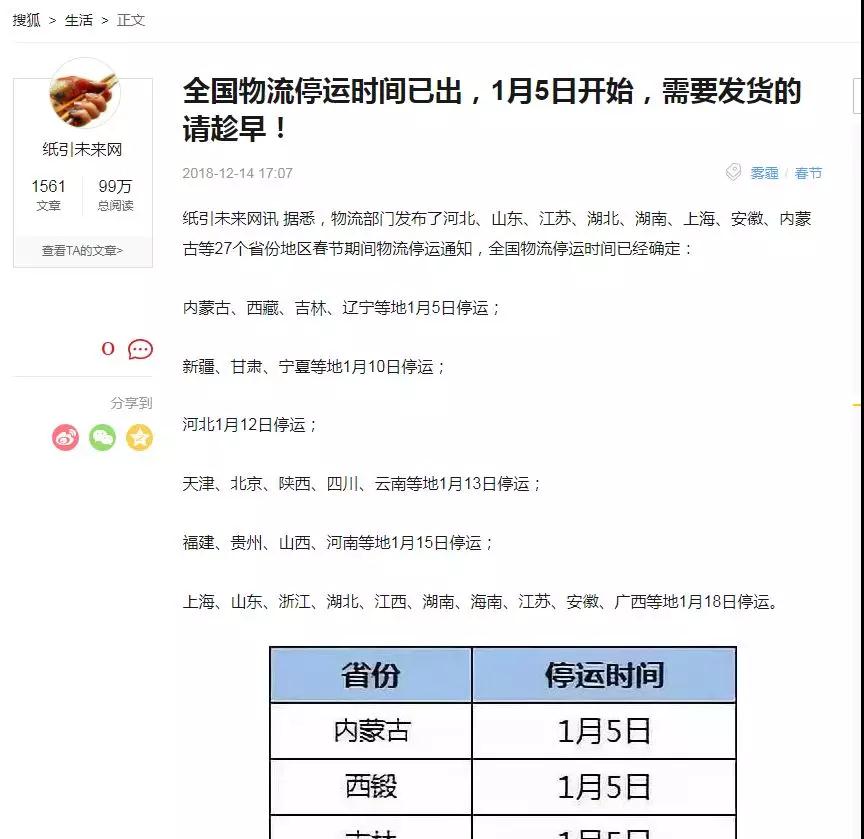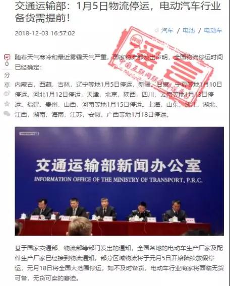 中国互联网联合辟谣平台提醒大家,物流公司放假或是运输线停运并非由政府部门统一规定,而是公司根据情况自行决定。物流公司会通过官网、微信公号或是发通知函等方式告知客户。所以,消息中提及的“电动车行业商家”无需担心“物流停运”而不知!至于普通快递,网友问问片区的快递员,就知道什么时候不收快递了!(张智萍 张景云)
