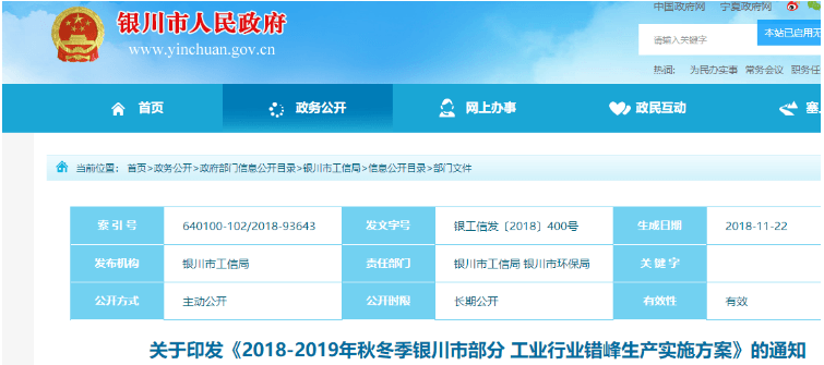 附原文:关于印发《2018-2019年秋冬季银川市部分工业行业错峰生产实施方案》的通知