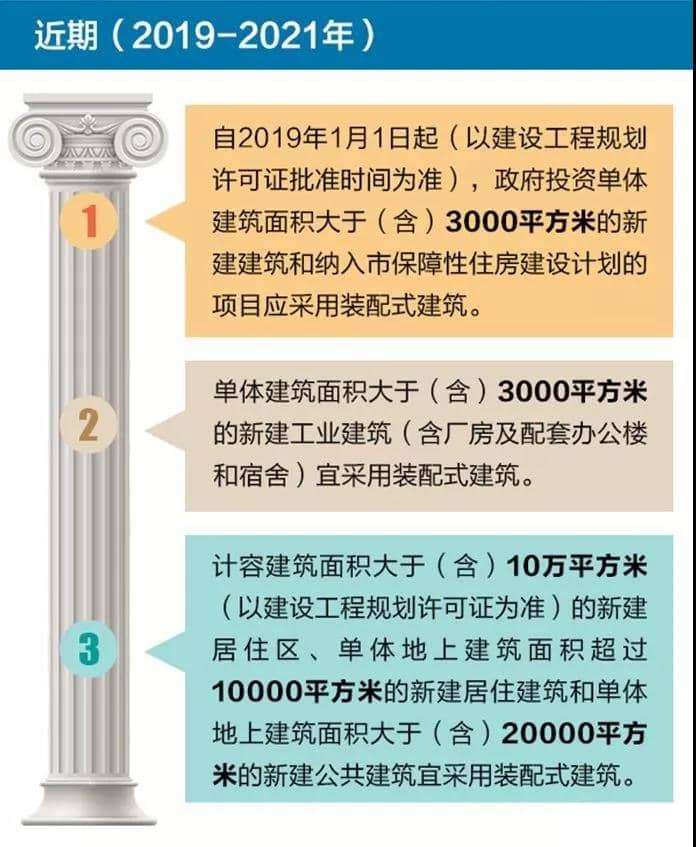 近年来,党中央、国务院和省委、省政府以及市委、市政府高度重视发展装配式建筑。装配式建筑的规划自2015年以来密集出台,2015年末,住建部发布了《工业化建筑评价标准》;2016年2月,国务院印发了《中共中央 国务院关于进一步加强城市规划建设管理工作的若干意见》,明确提出:大力推广装配式建筑,建设国家级装配式建筑生产基地。加大政策支持力度,力争用10年左右时间,使装配式建筑占新建建筑的比例达到30%;2016年9月27日国务院出台《关于大力发展装配式建筑的指导意见》(国办发﹝2016﹞71号),对大力发展装配式建筑和钢结构重点区域、未来装配式建筑占比新建筑目标、重点发展城市进行了明确,该意见再次提出力争用10年左右时间,使装配式建筑占新建建筑的比例达到30%;2017年4月,广东省人民政府办公厅印发了《广东省人民政府办公厅关于大力发展装配式建筑的实施意见》(粤府办﹝2017﹞28号)更加进一步细化了广东省装配式发展的要求。我市处于珠三角城市群列,是重点推进地区,要求到2020年年底前,装配式建筑占新建建筑面积比例达到15%以上。到2025年年底前,装配式建筑占新建建筑面积比例达到35%以上;2017年12月,住建部发布了《装配式建筑评价标准》,进一步规范了装配式建筑的评价。
