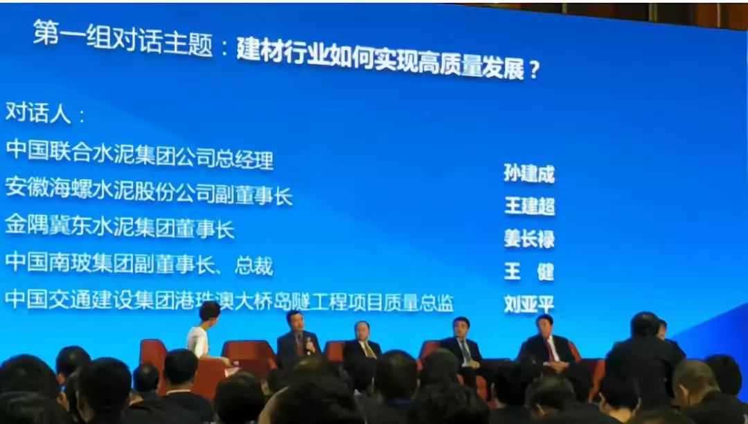 随后,整个会议进行第一个议程,由中国联合水泥集团公司总经理孙建成、安徽海螺水泥股份公司副董事长王建超、金隅冀东水泥集团董事长姜长禄、中国南玻集团副董事长、总裁王健、中国交通建设集团港珠澳大桥岛隧工程项目质量总监刘亚平就“如何实现建材行业高质量发展”展开激烈的讨论。