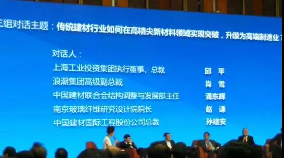 上海工业投资(集团)有限公司执行董事、总裁邱平,浪潮集团高级副总裁、中国检验检测学会质量链工作委员会主任肖雪、中材高新材料股份有限公司总裁张伟儒、南京玻纤院董事长赵谦、蚌埠玻璃工业设计研究院常务副院长马立云就“传统建材如何在高精尖新材料领域实现突破,推动建材行业升级为高端制造业”交换了意见。