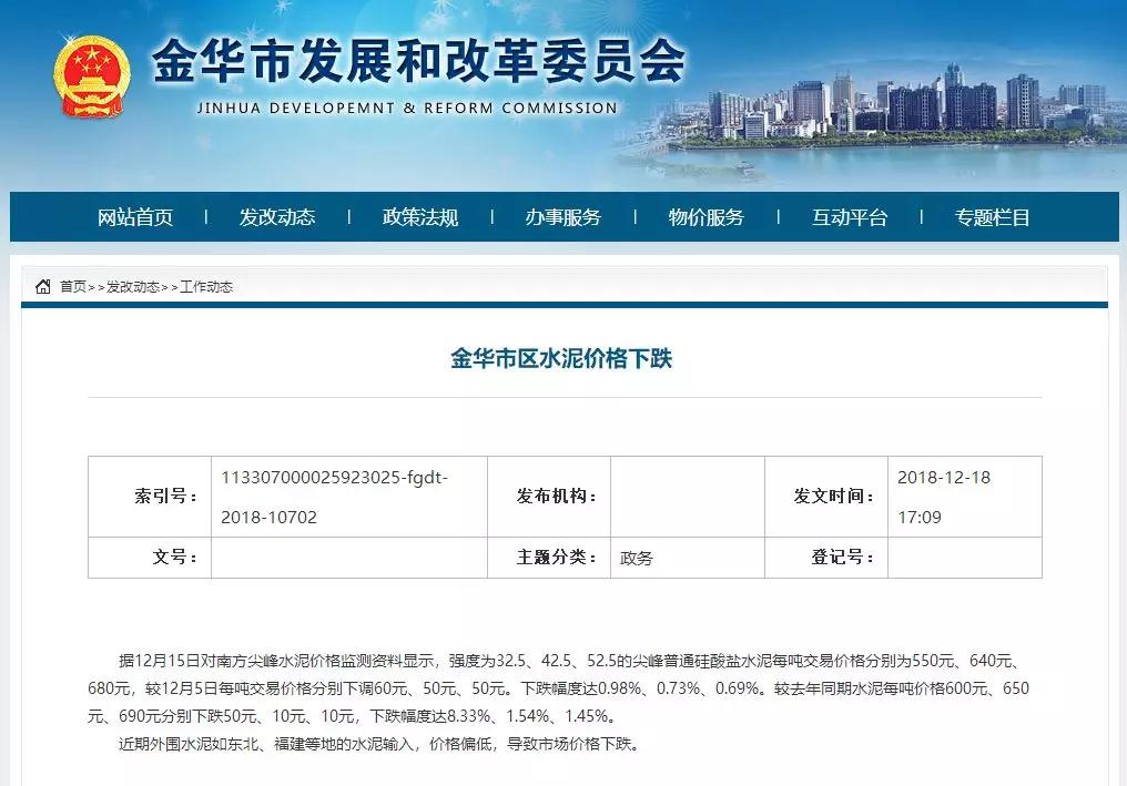 同期浙江金华的水泥价格也出现了下跌。