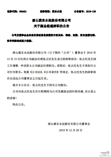 唐山冀东水泥股份有限公司(以下简称“公司”)董事会于2018年12月19日收到公司副总经理张占民先生递交的辞职报告,张占民先生因工作调整,申请辞去公司副总经理职务。