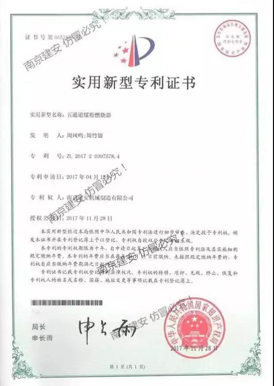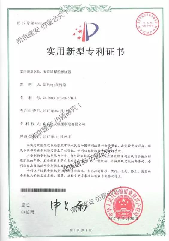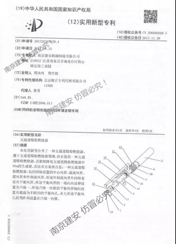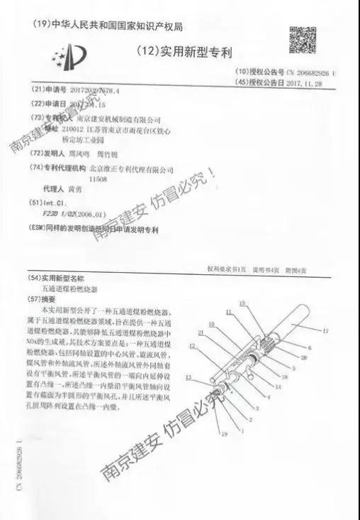 南京建安机械制造有限公司(以下简称“南京建安机械”)研制的新一代五风道燃烧器已注册过多项专利,(专利见图)目前市场已有仿制抄袭我公司五风道燃烧器平衡风案例,南京建安机械将通过各种渠道坚决维护公司权益。