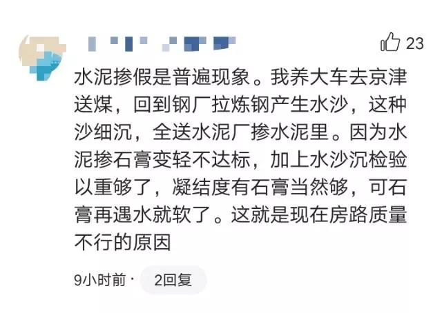 1、有网友说:水泥掺假是普遍现象。我养大车去京津送煤,回到钢厂拉炼钢产生水沙,这种沙细沉,全送水泥厂掺水泥里。因为水泥掺石膏变轻不达标,加上水沙沉检验以重够了,凝结度有石膏当然够,可石膏再遇水就软了。这就是现在房路质量不行的原因。
