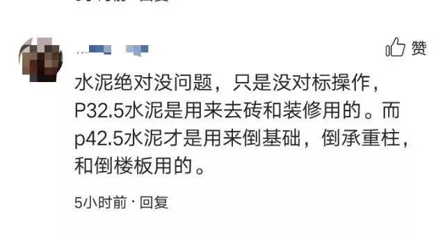 2、还有的网友说:水泥绝对没问题,只是没对标操作,P32.5水泥是用来去砖和装修用的。而P42.5水泥才是用来倒基础,倒承重柱,和倒楼板用的。