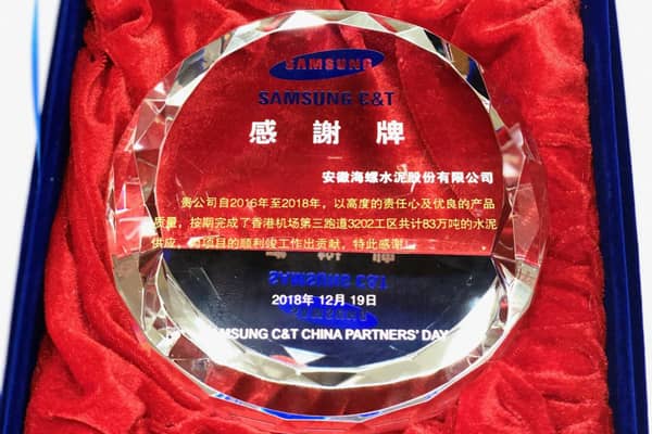 2018年12月19日上午,韩国三星物产公司在上海元一希尔顿酒店召开中国供应商大会,上海海螺国贸受邀参加了会议,会议授予海螺水泥“优秀供应商”称号,向海螺水泥在确保香港国际机场第三跑道DCM项目3202标段顺利竣工做出的卓越贡献表示感谢。