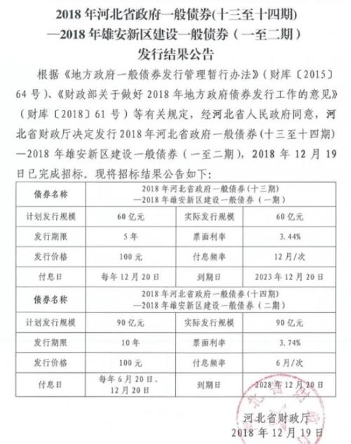 此前,河北省财政厅发行的2018年河北省政府一般债券(十三至十四期)、2018年雄安新区建设一般债券(一至二期)已于12月19日完成招标。