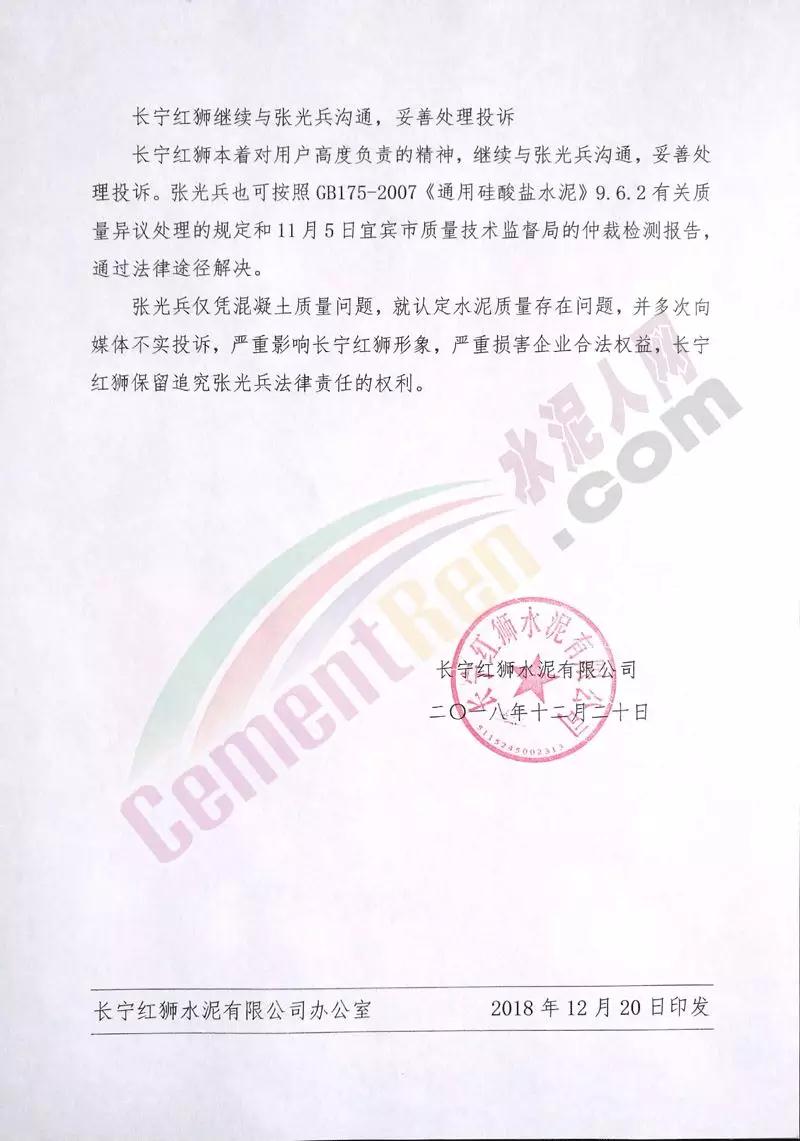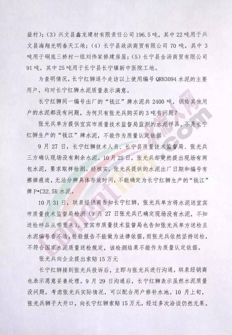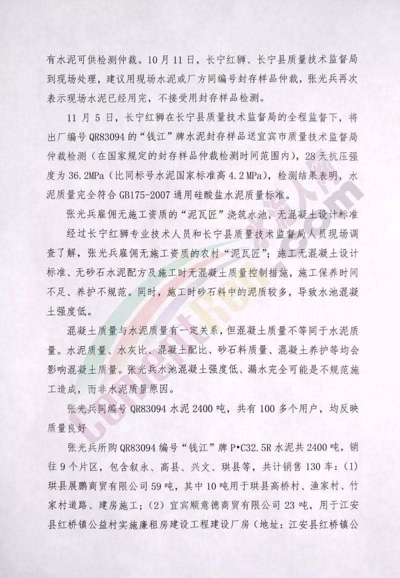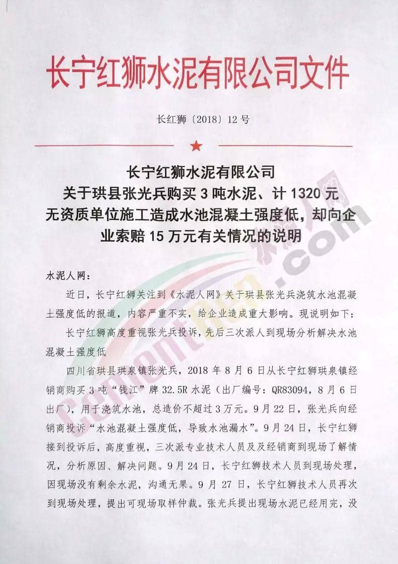 日前,位于四川省宜宾市长宁县硐底镇的长宁红狮被质疑水泥质量不合格:珙县居民张光兵在珙县展鹏商贸有限责任公司购买了数吨红狮水泥,用于修建水池,水池修好后出现漏水现象,而且水泥块一捏就碎,张光兵等人开始怀疑水泥质量问题,此事件经水泥人网报道后,长宁红狮非常重视,第一时间向水泥人网发来情况说明,具体内容如下: