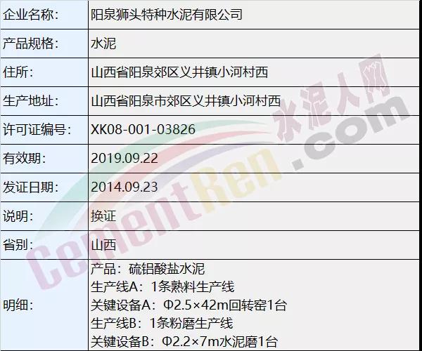 质检总局生产许可证办公室数据显示阳泉狮头特种水泥有限公司主要以生产铝酸盐水泥系列为主,为窑磨一体全能企业,熟料生产线关键设备为Φ2.5×42m回转窑1台;水泥粉磨生产线关键设备为Φ2.2×7m水泥磨1台。