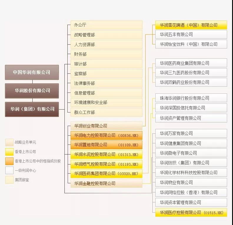 华润集团的前身是于1938年在香港成立的“联和行”。距今已有八十余年的历史,主营业务涉及大消费(零售、啤酒、食品、饮料)、电力、地产、水泥、燃气、大健康(医药、医疗)、金融等。集团下设7大战略业务单元、18家一级利润中心,实体企业1987家,直属企业中有6家在港上市,其中华润电力、润置地位列香港恒生指数成份股。