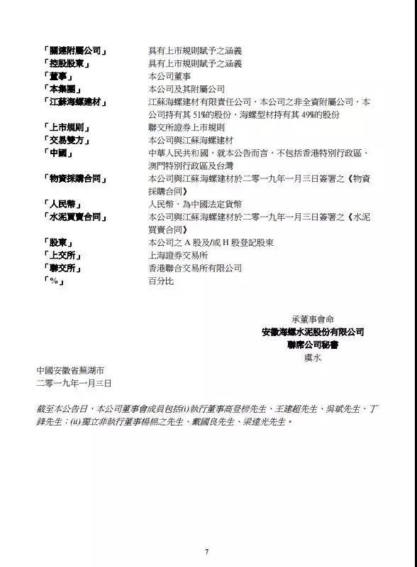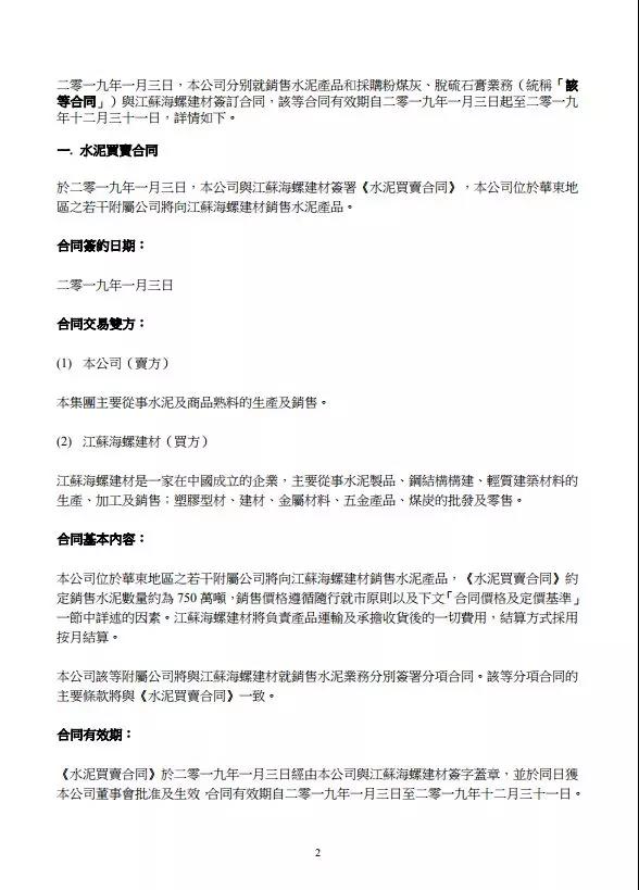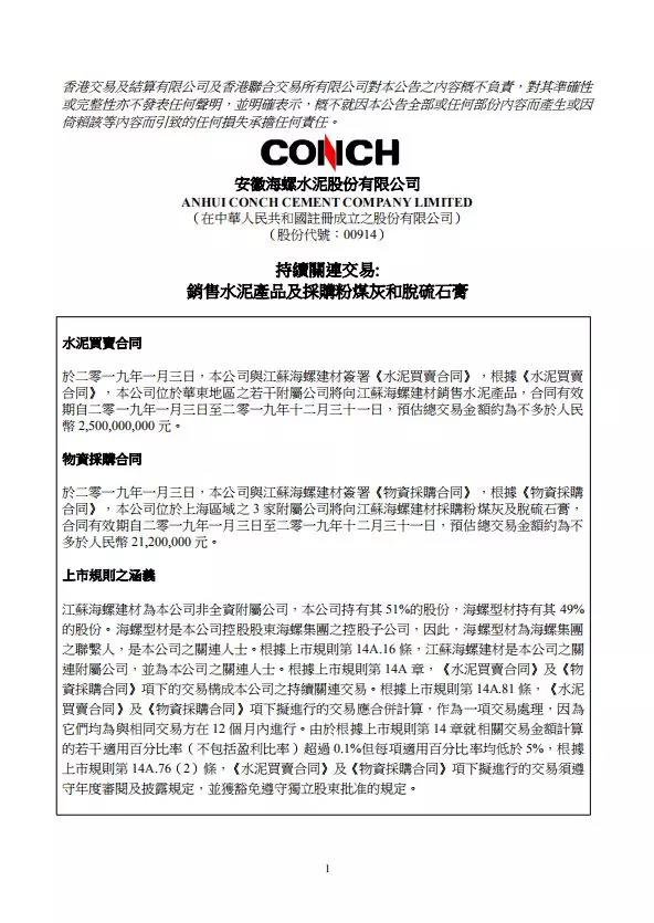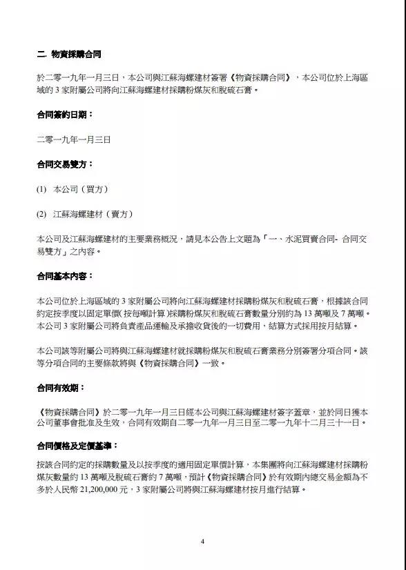同日,公司与江苏海螺建材签署《物资采购合同》,根据《物资采购合同》,公司位于上海区域的3家附属公司将向江苏海螺建材采购粉煤灰及脱硫石膏,合同有效期自2019年1月3日至2019年12月31日,预估总交易金额约为不多于人民币2120万元。