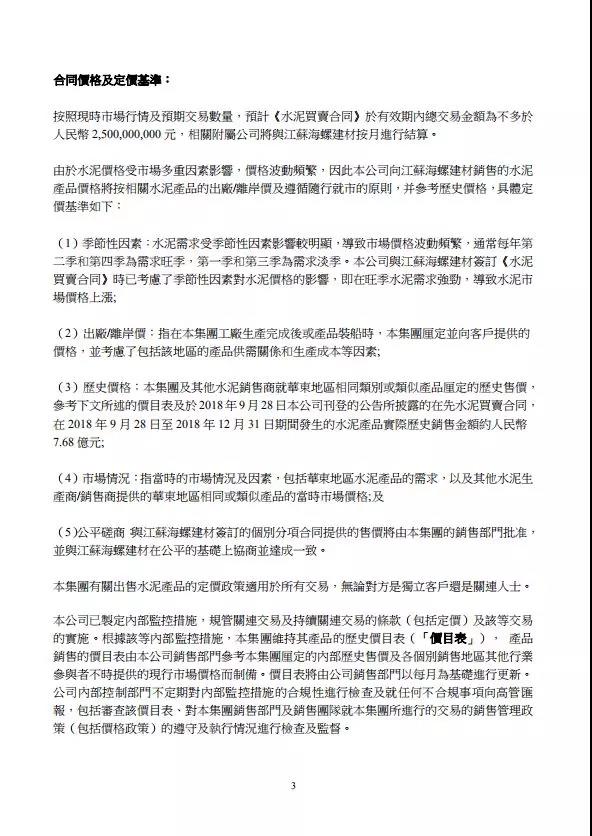 水泥人网通讯员消息:2019年1月3日,海螺水泥(00914.HK)公布,公司与江苏海螺建材签署《水泥买卖合同》,根据《水泥买卖合同》,公司位于华东地区的若干附属公司,将向江苏海螺建材销售水泥产品,合同有效期自2019年1月3日至2019年12月31日,预估总交易金额约为不多于人民币25亿元。