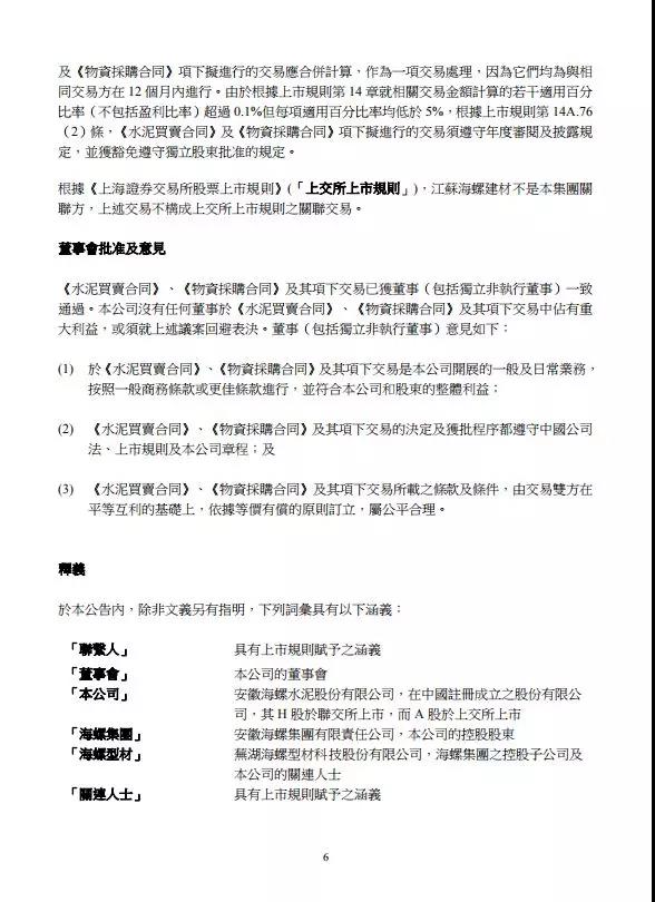 根据上市规则第14A.16条,江苏海螺建材是公司关连附属公司,并为公司关连人士。根据上市规则第14A章,《水泥买卖合同》及《物资采购合同》项下的交易构成公司持续关连交易。
