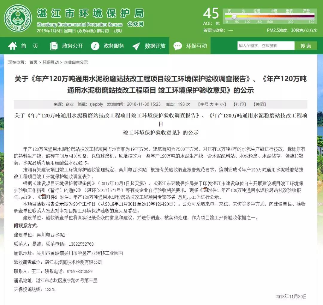 据查询,吴川市粤西水泥厂于1990年03月05日在吴川市工商行政管理局注册成立。此前,湛江市环境保护局官网曾发布关于《年产120万吨通用水泥粉磨站技改工程项目竣工环境保护验收调查报告》、《年产120万吨通用水泥粉磨站技改工程项目 竣工环境保护验收意见》的公示文件。