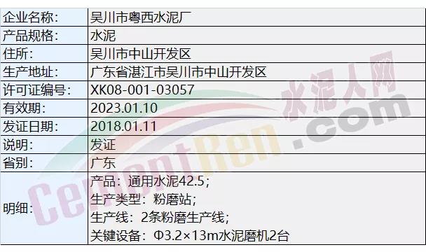 国家质检总局生产许可证办公室数据显示吴川市粤西水泥厂生产类型为水泥粉磨站,其产品为通用水泥42.5;拥2条粉磨生产线Φ3.2×13m水泥磨机2台。发证日期为2018年1月11日。