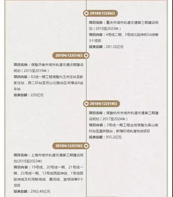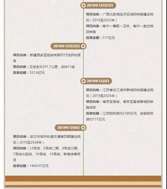2019年开工第一周,国家发改委先后批复了《江苏省沿江城市群城际铁路建设规划(2019-2025年)》和《武汉市城市轨道交通第四期建设规划(2019—2024年)》,两个规划涉及投资3786亿元。而在此之前,已有广西北部湾经济区、上海、重庆、杭州、济南等多个轨道交通规划获批复。