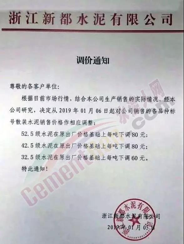 根据海螺调价涵及本地行情,我公司从2019年1月06日08:00起,32.5各品种水泥下调60元/吨,42.5各品种水泥下调80元/吨,对于本次价格调整对贵单位造成的不便,请给予理解和支持。