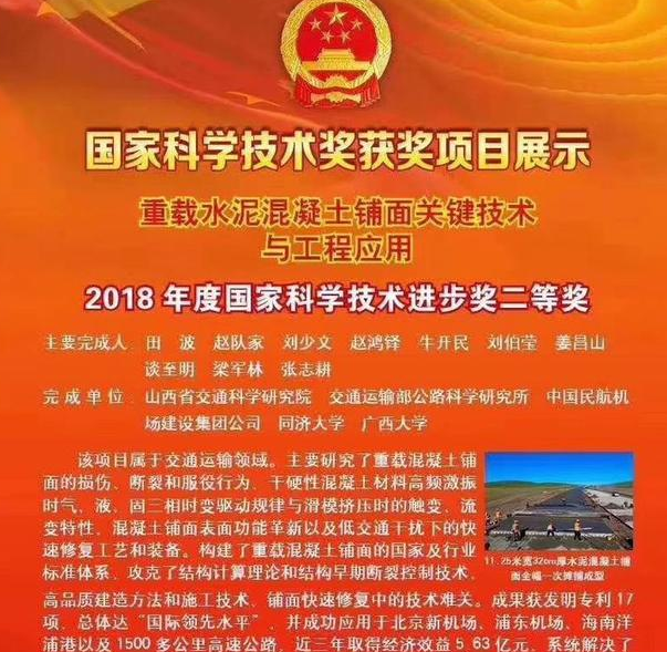 1月8日上午,在北京召开的国家科学技术奖励大会上,宣布了《国务院关于2018年度国家科学技术奖励的决定》。山西省共有3项科研成果获得国家科学技术进步奖(通用项目)二等奖,其中山西省主持完成的1项,参与完成的2项。山西交控集团旗下山西省交通科学研究院主持完成的“重载水泥混凝土铺面关键技术与工程应用”项目荣获国家科学技术进步二等奖,是山西这次唯一主持完成的获奖项目。