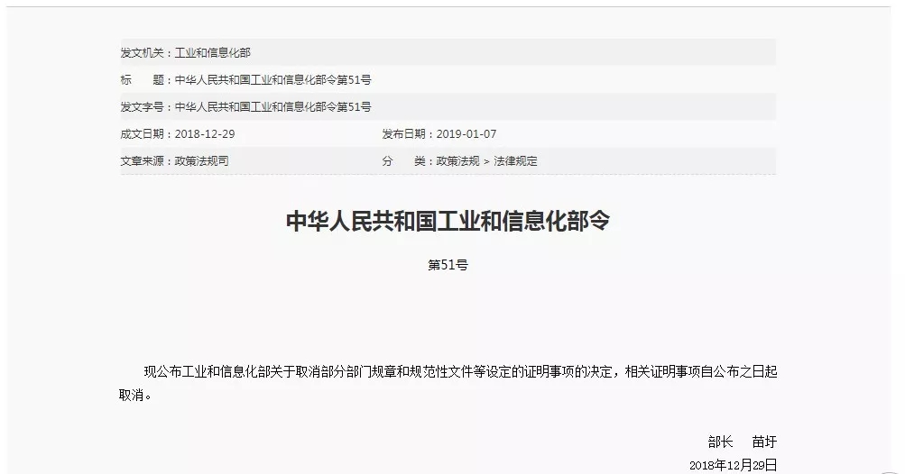 对于出台本次《决定》的原因,工信部政策法规司解释证明事项清理工作是党中央、国务院减证便民、优化服务的重要举措。“根据《关于做好证明事项清理工作的通知》(国办发〔2018〕47号)要求和司法部的统一部署,工业和信息化部组织开展了证明事项清理相关工作,全面摸底梳理,深入研究论证,形成了《决定》。”