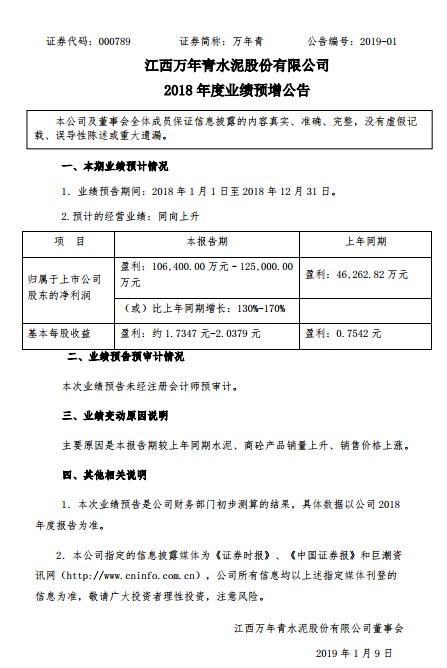 万年青发布业绩预增公告。2018年度预盈10.64亿元至12.5亿元,同比增长130%-170%。报告期水泥、商砼产品较上年同期销量上升、售价上涨。