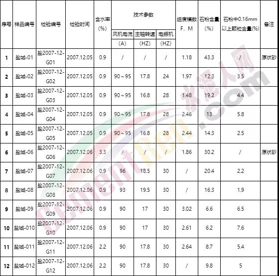(2)从本次第9~12次试验(试验编号盐2007—12—G09~G12)可知,在保证供料稳定和脱粉机在同一技术参数的情况下,成品砂中石粉含量在一个稳定的范围内是有可能的。