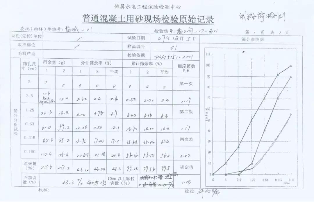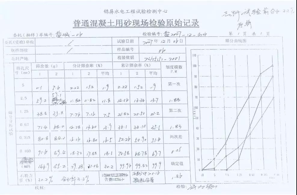 锦屏三滩水电项目所需大量骨料就地取材,采用三滩大理岩,可项目方进行了多次全程制砂试验,制得的原状砂石粉含量均在30%以上,最高含量(<0.16mm)达到43.3%,细度模数在1.18~2.13之间波动。原状砂经水洗(或加大冲洗水量)后螺旋洗砂机回收的成品砂中的石粉含量基本上都大于18%,最高达到32%。同时,被水洗出去的石粉中仍然含有20~30%大于0.16mm的颗粒,细砂流失严重,无法满足工程所规定的成品砂中石粉含量6~18%的要求。