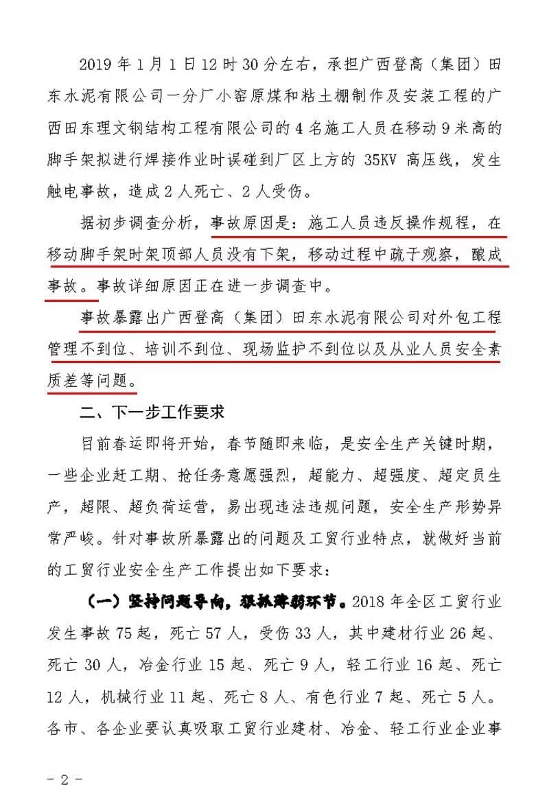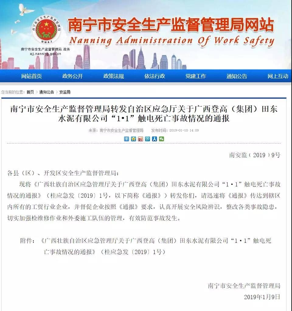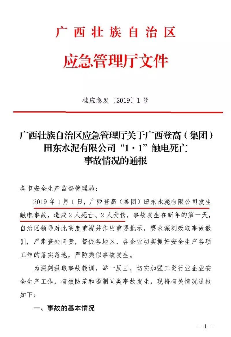 附:广西壮族自治区应急管理厅关于广西登高(集团)田东水泥有限公司“1_1”触电死亡事故情况的通报
