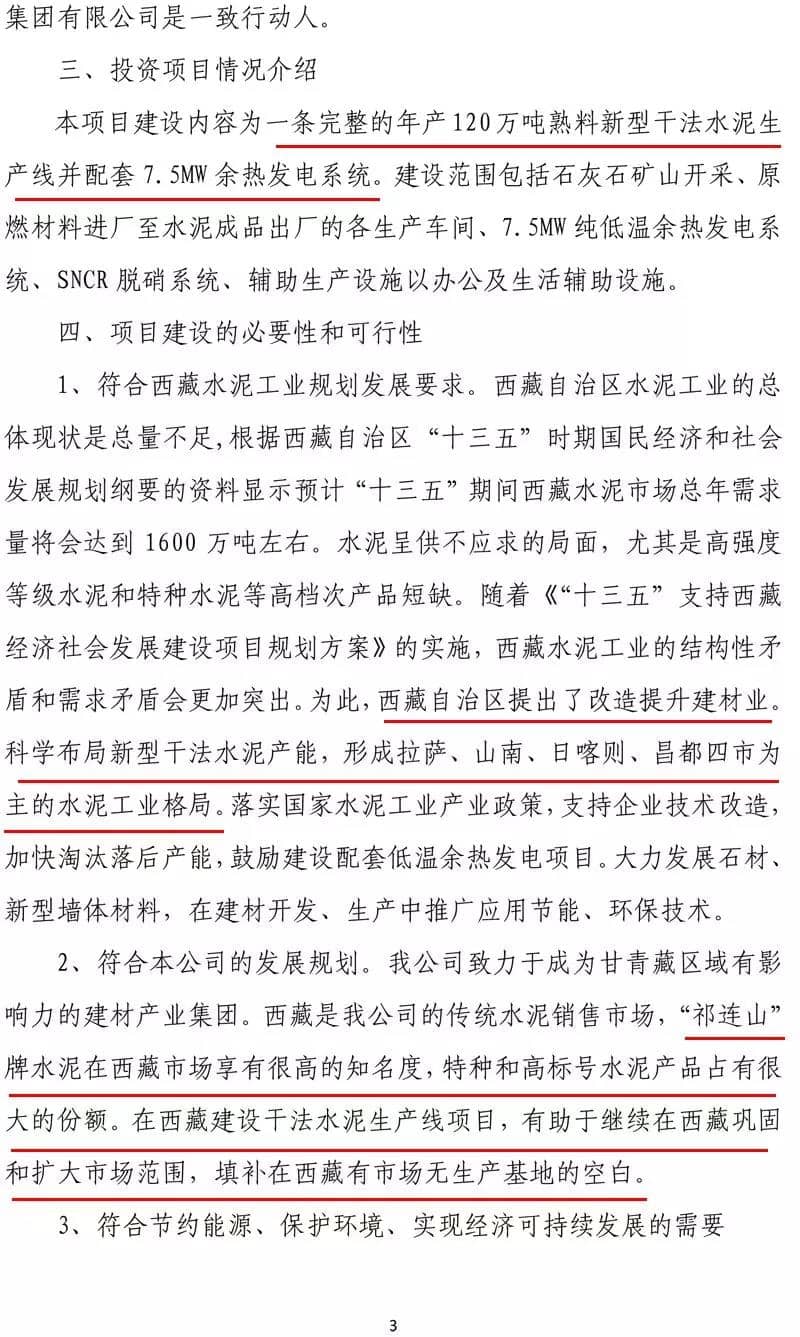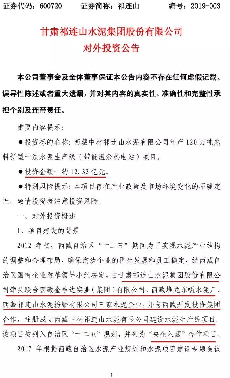 水泥人网消息:1月11日晚间,祁连山(600720)公告称,控股子公司西藏中材祁连山水泥拟投资12.33亿元建设年产120万吨熟料新型干法水泥生产线(带低温余热电站)项目。