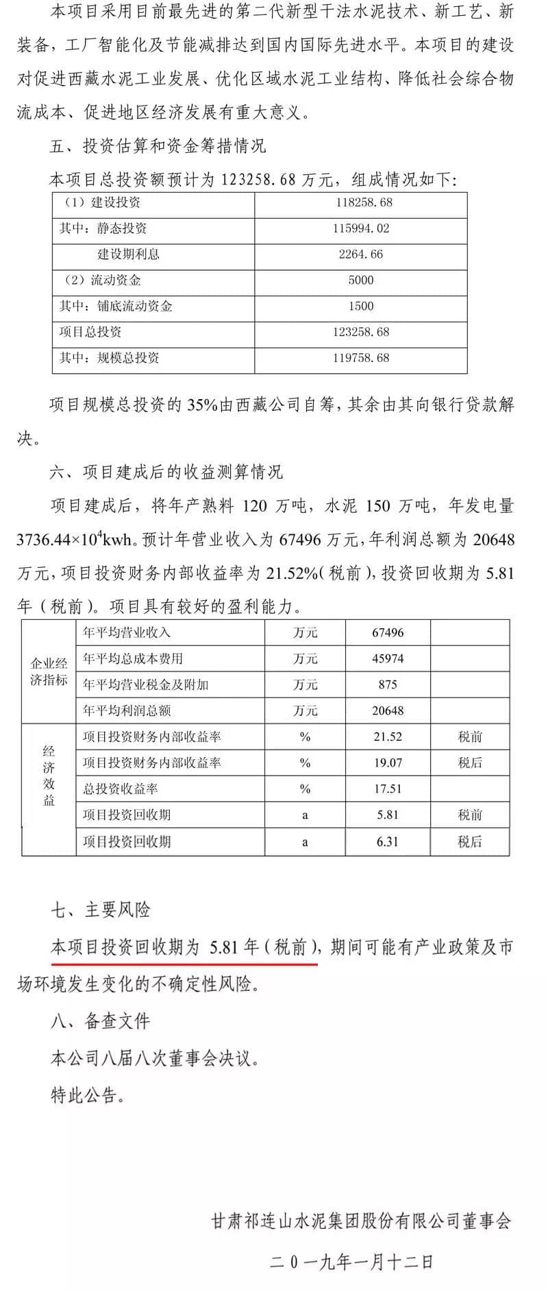 项目建成后,将年产熟料120万吨,水泥150万吨,年发电量3736.44×104kwh。预计年营业收入为6.75亿元,年利润总额为2.06亿元,项目投资财务内部收益率为21.52%(税前),投资回收期为5.81年(税前),具有较好的盈利能力。公告原文如下: