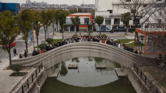1月12日,世界最大规模3D打印混凝土步行桥在沪落成启用,人们站在桥体上欢庆该新兴建筑体的诞生。