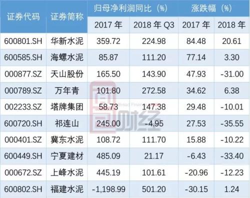 这其中,华新水泥(17.37 +0.99%,诊股)(600801.SH)表现尤为亮眼,2017年及2018年前三季度归母净利润同比增幅均超过2倍,2017年及2018年股价年度涨幅分别为84.48%及20.61%,均位于行业首位。
