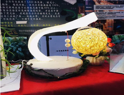 炫目的光芒从让人不免把目光移至第二组设计的“Light&Night”上。以工业副产物脱硫石膏为原料的底座能有效调节室内温度,利用环氧树脂浇筑成型的灯架中掺杂了荧光粉,即使关灯也能发出微微荧光。而灯头的LED冷光源更与“节能”相契合,在提供照明的同时大限度地减少了能耗。