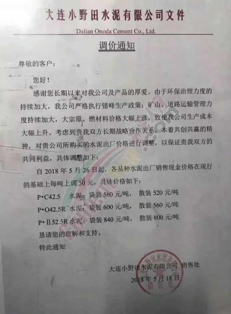 2018年5月18日大连小野田水泥有限公司销售处发布调价通知称,由于环保治理力度的持续大加,公司严格执行错峰生产政策;矿山、道路运输管理力度加大,大宗原、燃材料价格大幅上涨,致使公司生产成本大幅上升。为保证企业与用户的共同利益,将水泥价格上调。其中P.II52.5R袋装水泥市场零售到位价在860-870元/吨。