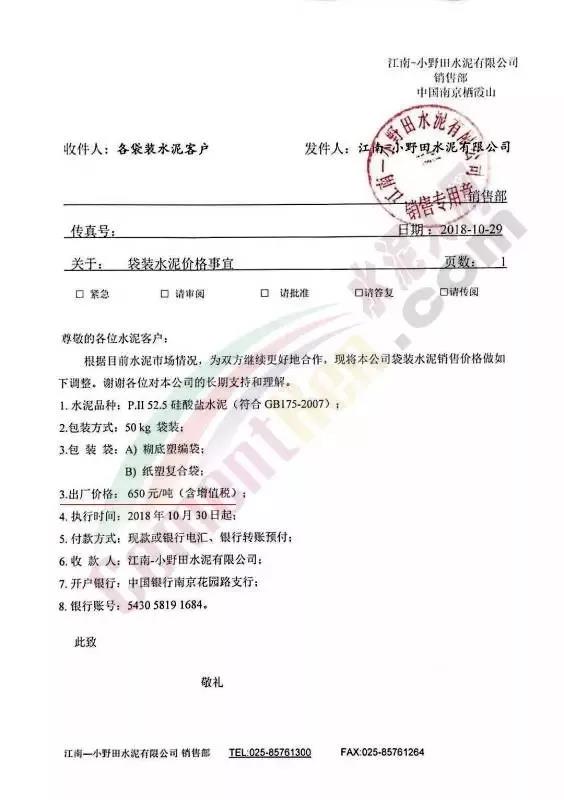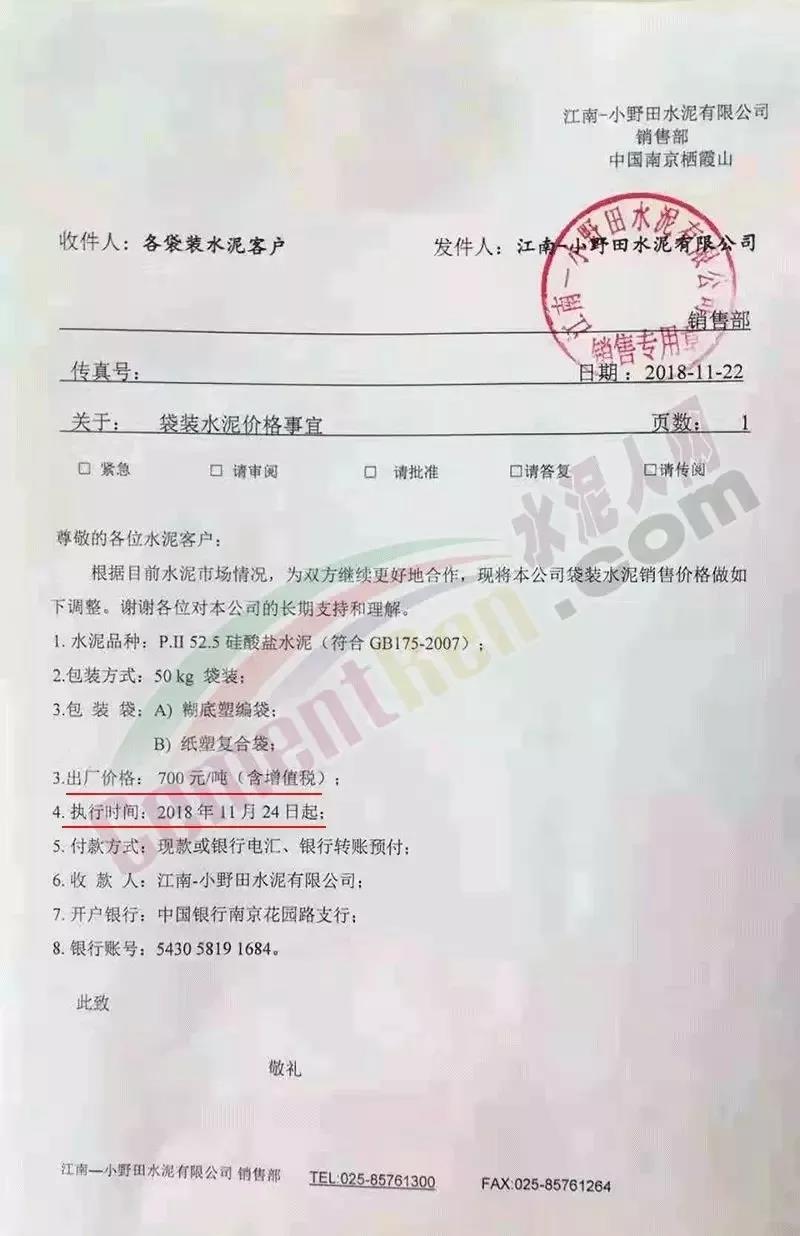2018年10月30日江南-小野田水泥有限公司销售部中国南京栖霞山厂发出水泥调价通知称:根据目前水泥市场情况,为双方继续更好的合作,将公司袋装水泥销售价格上调。上调之后执行价高达650元/吨。时隔月余这家企业再发通知上调P.II52.5硅酸盐水泥价格,上调后出厂价格执行700元/吨,市场到位达接近800元/吨。