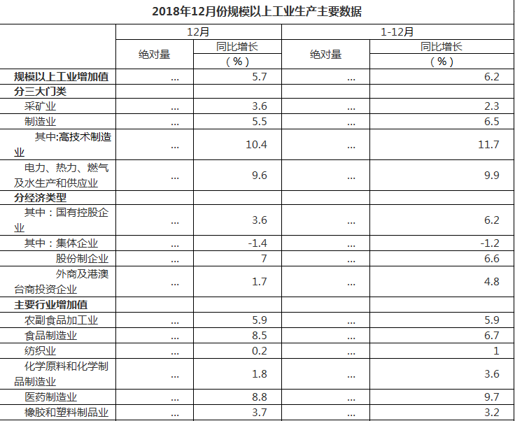 分三大门类看,12月份,采矿业增加值同比增长3.6%,增速较11月份加快1.3个百分点;制造业增长5.5%,回落 0.1个百分点;电力、热力、燃气及水生产和供应业增长9.6%,回落0.2个百分点。
