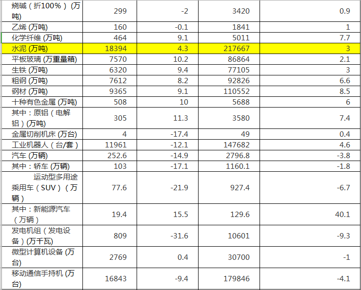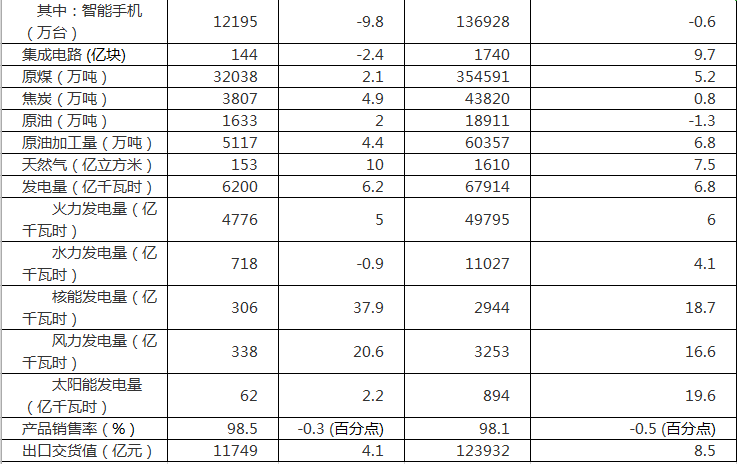 分产品看,12月份,596种产品中有330种产品同比增长。其中,钢材9365万吨,同比增长9.1%;水泥18394万吨,增长4.3%;十种有色金属508万吨,增长10.0%;乙烯160万吨,下降0.1%;汽车252.6万辆,下降14.9%,其中,轿车103.0万辆,下降17.1%;发电量6200亿千瓦时,增长6.2%;原油加工量5117万吨,增长4.4%。