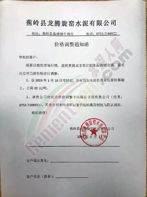 其中焦岭县龙腾旋窑水泥有限公司发价格调整通知函称,根据目前的市场行情,按照与客户签订的水泥购销合同,决定对当前水泥价格进行调整。自1月18日零时起,所有袋装水泥在现有结算价格基础上上调20元/吨。