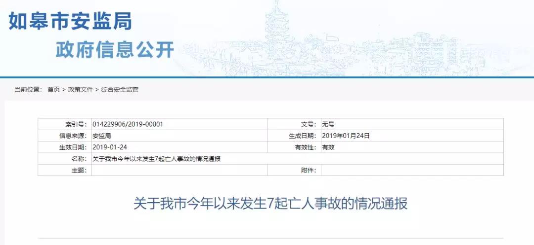 7.2019年1月18日14时左右,位于九华镇的如皋市龙珠服装有限公司在生产作业时,发生一起高处坠落事故,造成1人死亡。