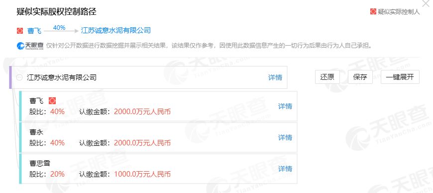 天眼查数据显示,江苏诚意水泥有限公司法定代表人曹忠雪,其拥有公司20%的股份。
