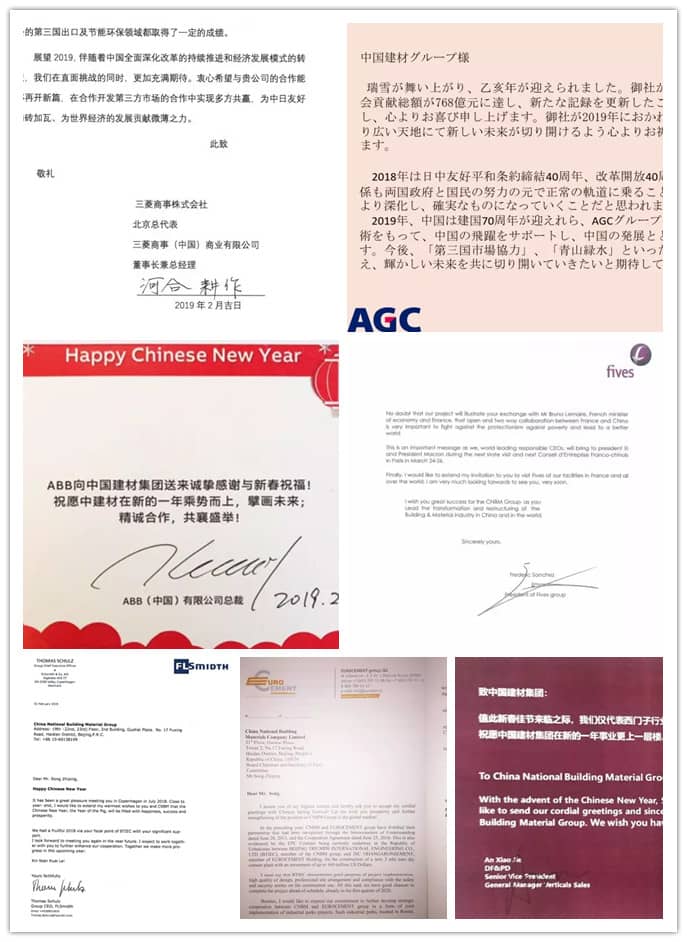 中国建材集团海外合作伙伴寄语集团2019年发展,其中既有拥有几十年合作历史的老朋友,也有在2018年结识的新朋友;既有基石业务持续推进中的支持者,也有三新产业开拓征途上的同行者。寄语中包含了对以往合作业绩上的总结和感恩,也有对未来深入合作的思考和期待。