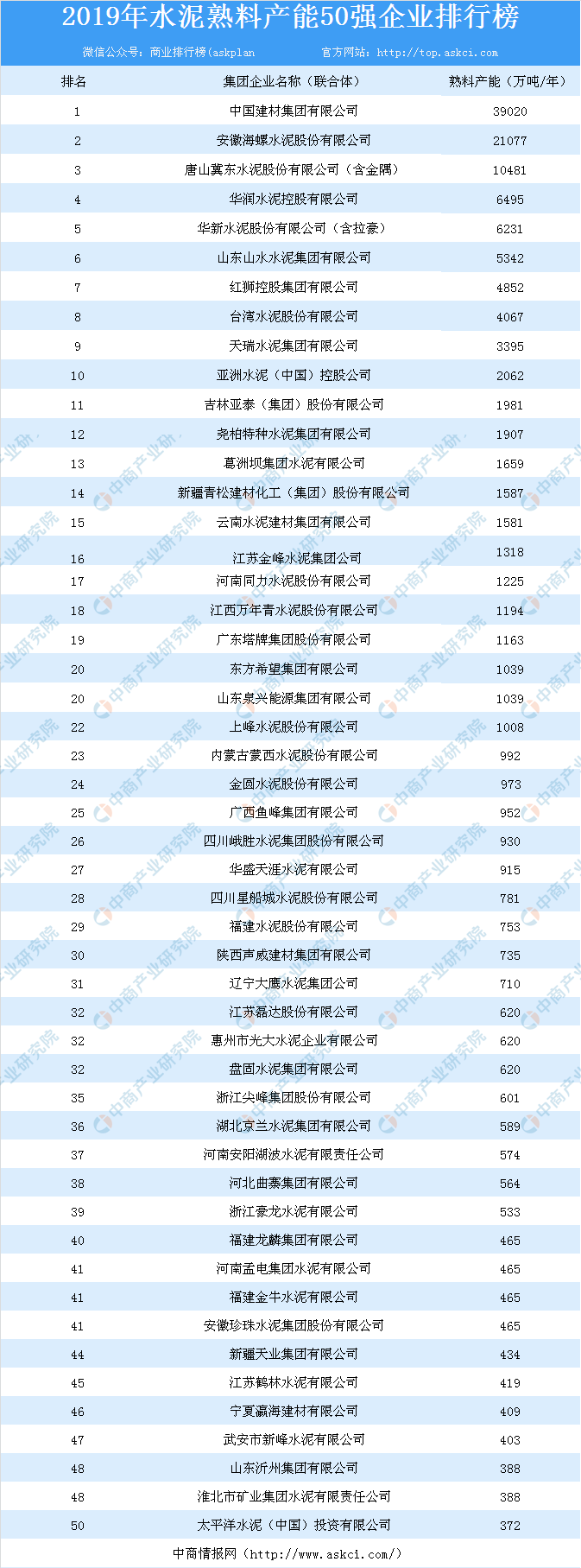 据数据统计显示:前10家大企业集团的水泥熟料年产能达到10.3亿吨,占全国总产能的57%,与上年相比保持持平。以下是2019年全国水泥熟料产能50强企业详细排名情况: