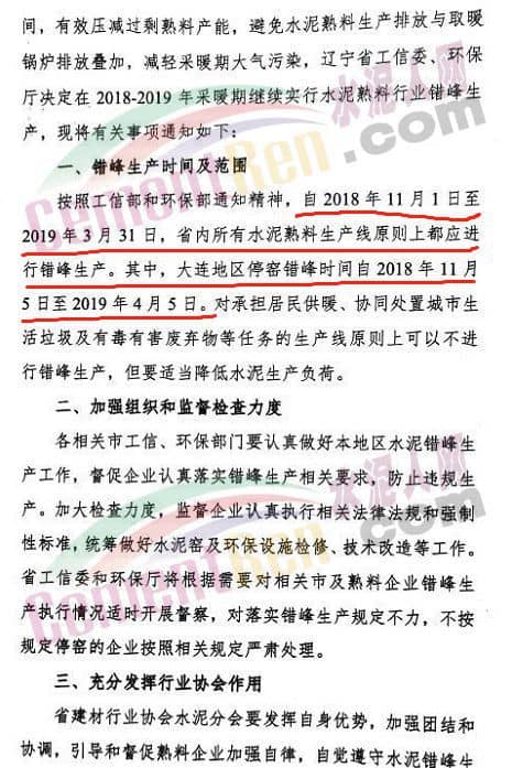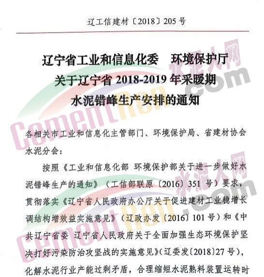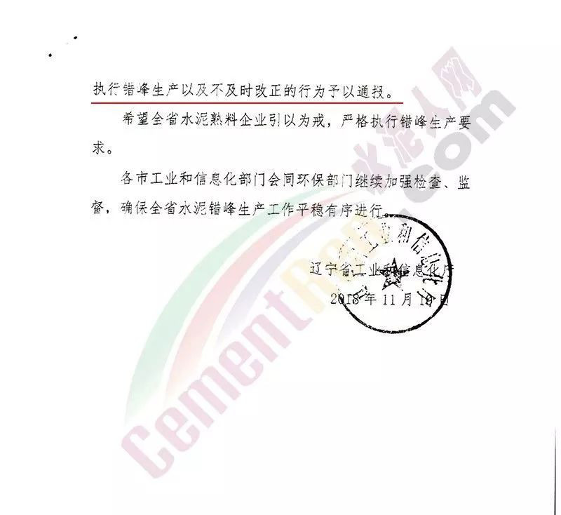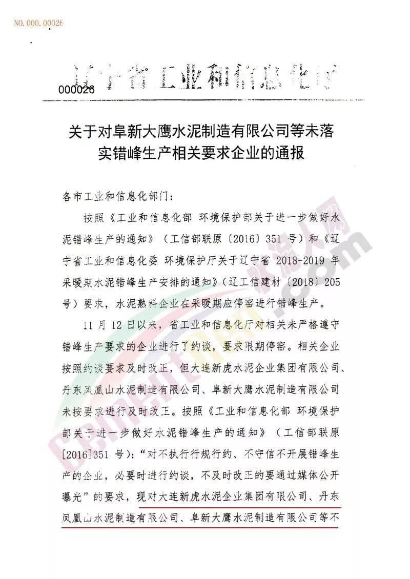 2018年11月10日辽宁省工信厅曾对大鹰水泥等企业未落实错峰生产相关要求企业做出公开通报,通报原文如下: