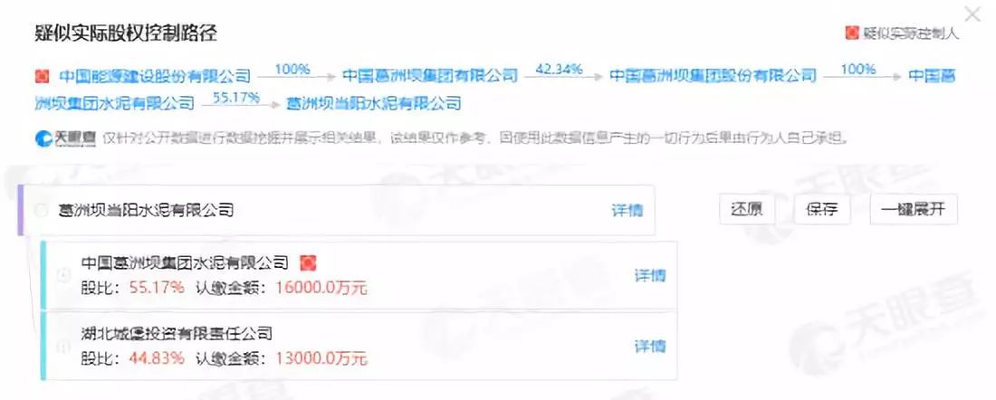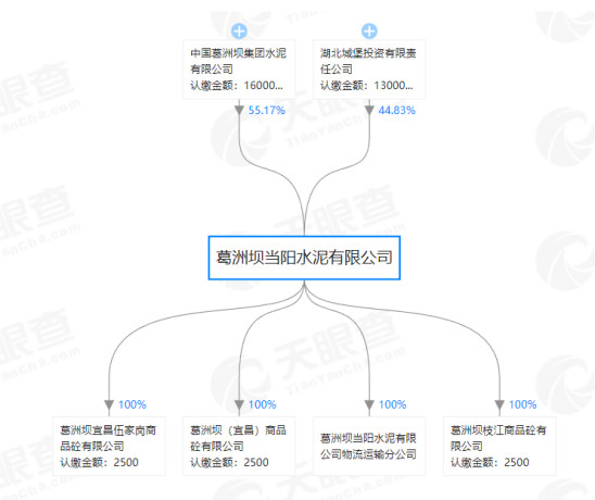 天眼查数据显示:葛洲坝当阳水泥为中国葛洲坝集团水泥有限公司和湖北城堡投资有限责任公司合资,由中国葛洲坝集团水泥有限公司控股。