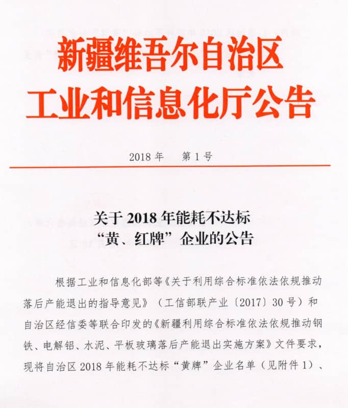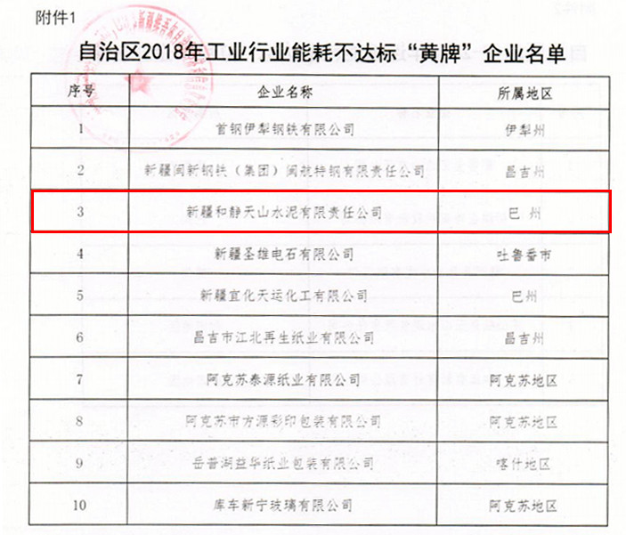 据水泥人网了解,在2018年12月,新疆维吾尔自治区工信厅发布了《关于2018年能耗不达标“黄、红牌”企业的公告》,公告中提到新疆和静天山水泥有限责任公司被列为新疆2018年工业行业能耗不达标“黄牌”企业。