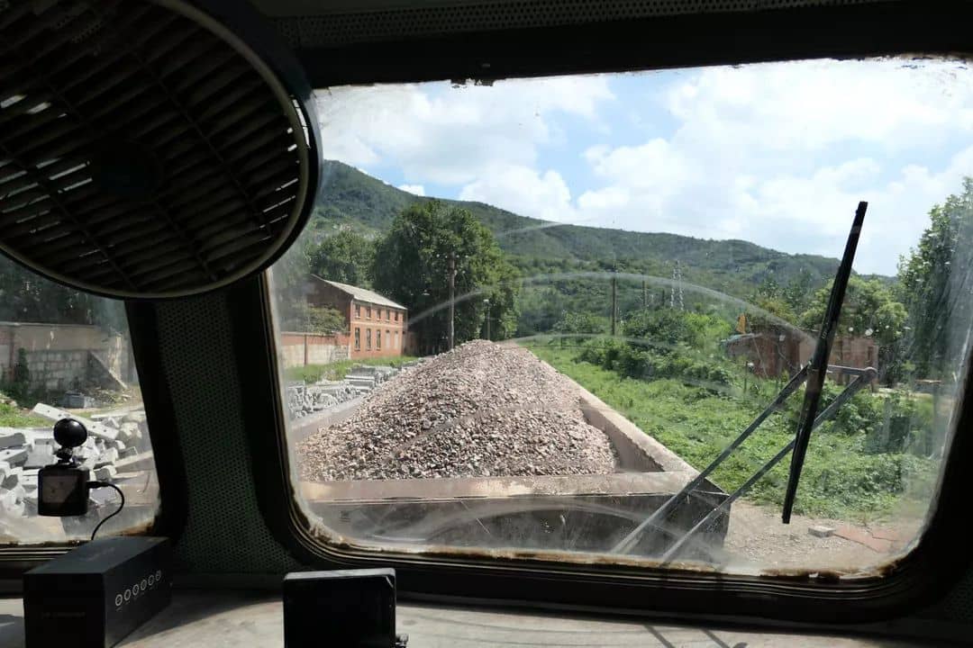装载货物的车厢是俗称“老K车”的自卸翻斗车,车厢上部的料斗在安装于车底架两侧的气缸的作用下可以向一侧翻起,卸下石料。这些“老K车”9节为一组,挂在机车后面,将从湖山矿开采出的石料运往龙潭厂。