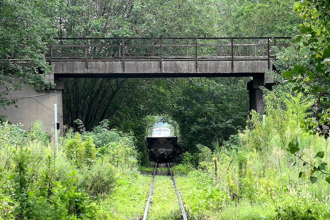 从矿区车站出发约1公里,下穿京沪高铁,再沿线路向北走约2公里,就可以到达有名的“南京大十字”——中国水泥厂的762毫米非电化窄轨铁路在此与江南水泥厂的900毫米电气化窄轨铁路十字立体交叉。中国厂专用线在下,江南厂专用线在上,这样在主用准轨的国度里出现两种不同轨距的窄轨十字交叉的景象举世鲜有。可惜的是,这次探访中笔者并没能捕捉到两种窄轨列车在此交会的情景,有些遗憾。