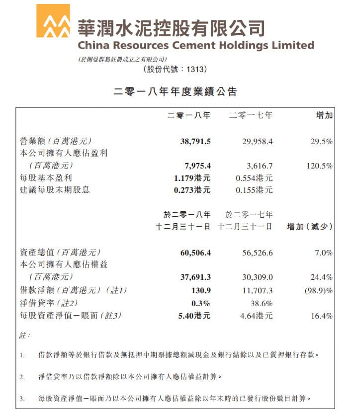 华润水泥控股(01313.HK)公布,截至2018年12月31日止年度,实现营业额387.92亿港元,同比增加29.5%;毛利154.20亿港元,同比增加67.05%,毛利率由去年同期的30.8%增至39.8%;公司拥有人应占盈利79.75亿港元,同比增加120.5%;每股基本盈利1.179港元;拟派末期股息每股0.273港元。
