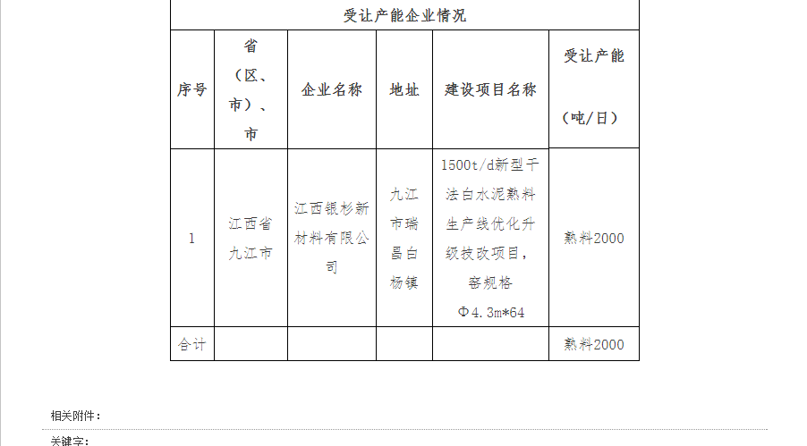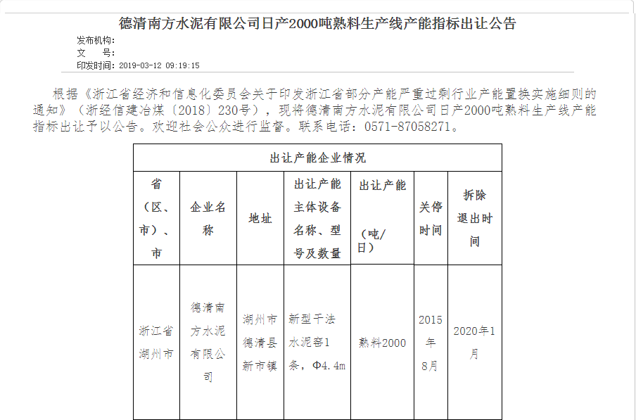 根据《浙江省经济和信息化委员会关于印发浙江省部分产能严重过剩行业产能置换实施细则的通知》现将德清南方水泥有限公司日产2000吨熟料生产线产能指标出让予以公告。